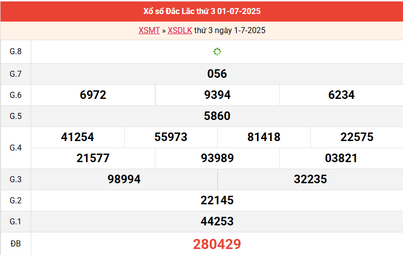 Mời các bạn xem lại bảng kết quả kỳ trước với giải đặc biệt, giải tám, lô tô 2 số để có thể đưa ra nhận định, phân tích dự đoán DLK ngày 8 tháng 7 năm 2025 chuẩn xác nhất.