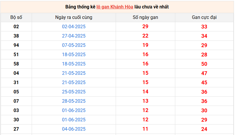Bảng thống kê lô gan XSKH lâu về nhất 16/7/2025