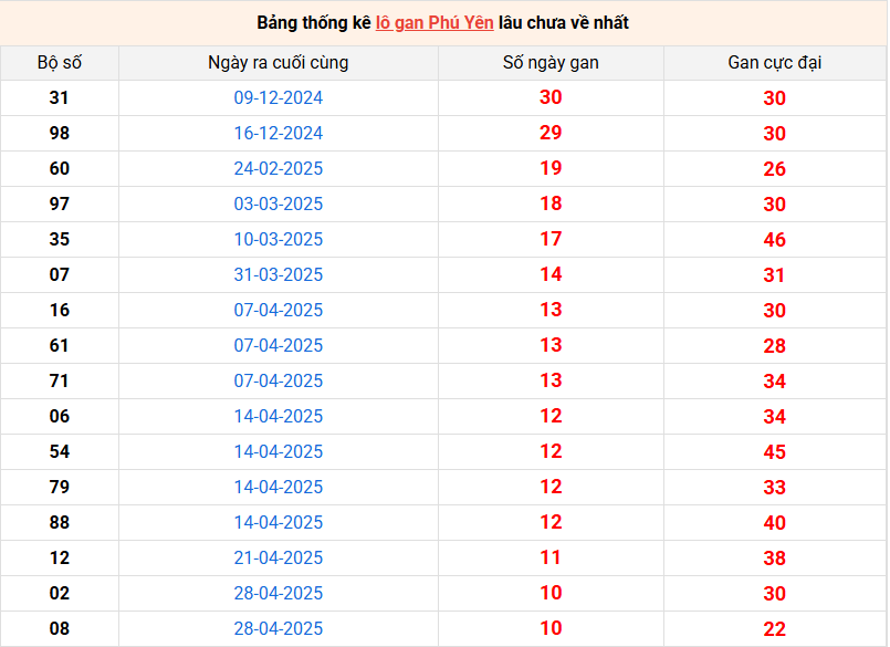 Bảng thống kê lô gan Phú Yên lâu về nhất 14/7/2025