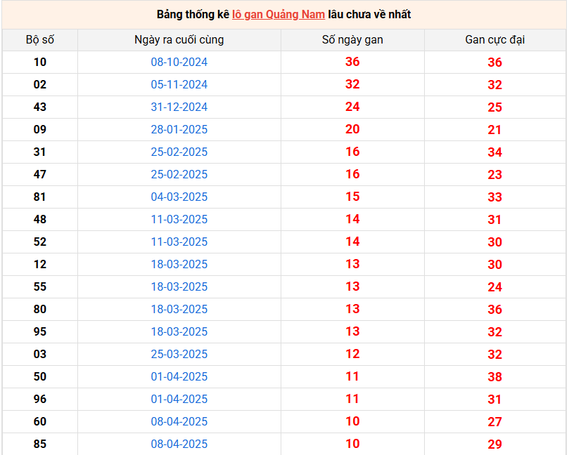 Bảng thống kê lô gan Quảng Nam lâu về nhất 24/6/2025