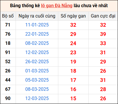 Bảng thống kê lô gan Đà Nẵng 7/5/2025