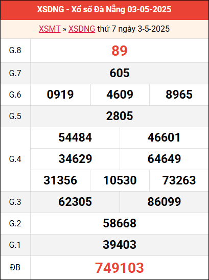 Mời các bạn xem lại bảng kết quả kỳ trước với giải đặc biệt, giải tám, lô tô 2 số để có thể đưa ra nhận định dự đoán DNG ngày 7 tháng 5 năm 2025 chuẩn xác nhất.