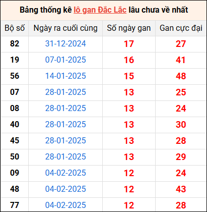 Bảng thống kê lô gan Đắk Lắk lâu về nhất 6/5/2025