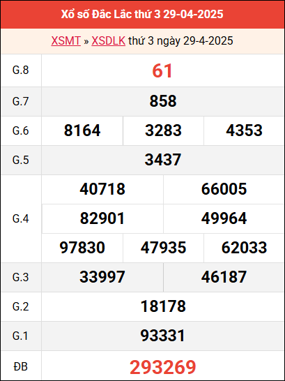 Mời các bạn xem lại bảng kết quả kỳ trước với giải đặc biệt, giải tám, lô tô 2 số để có thể đưa ra nhận định, phân tích dự đoán DLK ngày 6 tháng 5 năm 2025 chuẩn xác nhất.