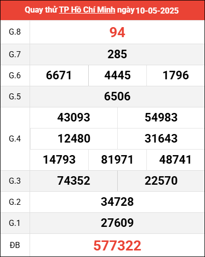 Mời các bạn xem lại bảng kết quả kỳ trước với giải đặc biệt, giải tám, lô tô 2 số để có thể đưa ra nhận định dự đoán HCM ngày 10 tháng 5 năm 2025 chuẩn xác nhất