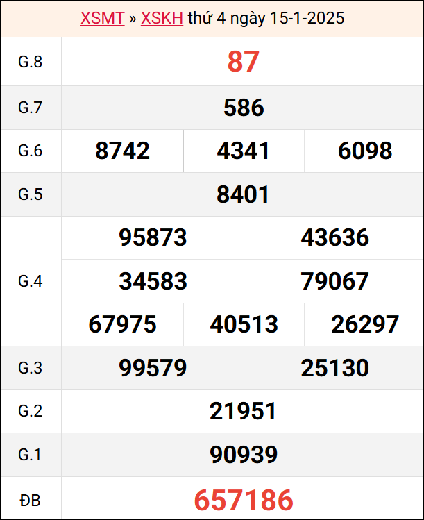 Mời các bạn xem lại bảng kết quả kỳ trước với giải đặc biệt, giải tám, lô tô 2 số để có thể đưa ra nhận định dự đoán KH ngày 19 tháng 1 năm 2025 chuẩn xác nhất.
