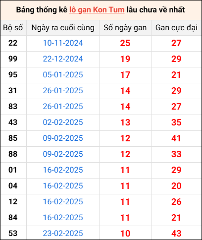 Bảng thống kê lô gan Kon Tum lâu về nhất 11/5/2025
