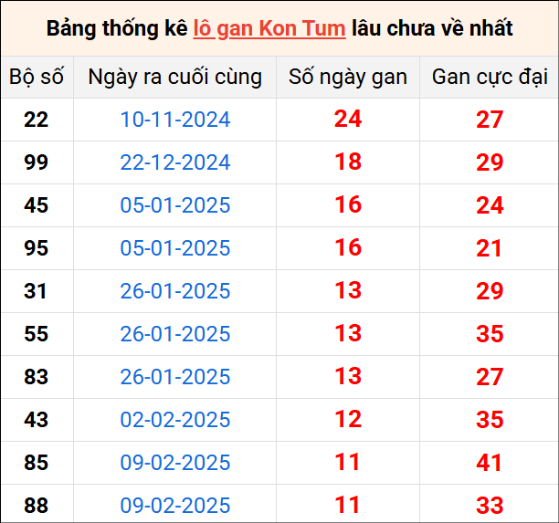 Bảng thống kê lô gan Kon Tum lâu về nhất 4/5/2025
