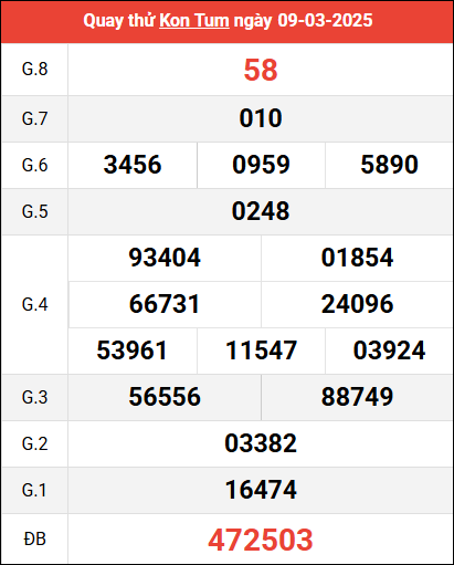 Mời các bạn xem lại bảng kết quả kỳ trước với giải đặc biệt, giải tám, lô tô 2 số để có thể đưa ra nhận định dự đoán KT ngày 9 tháng 3 năm 2025 chuẩn xác nhất.