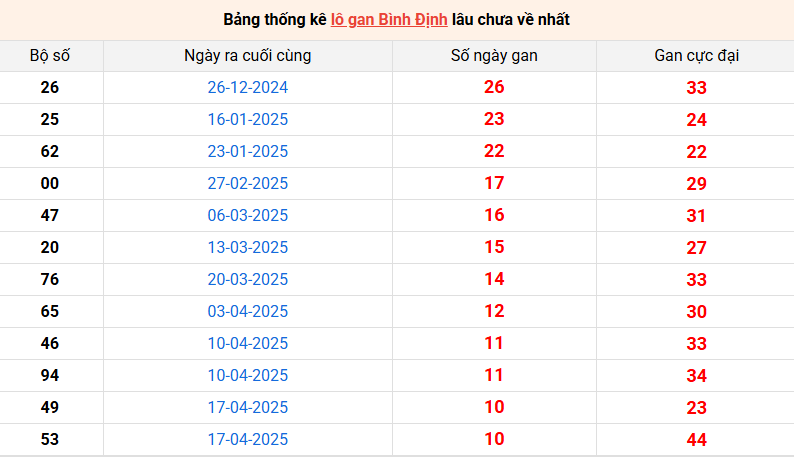 Bảng thống kê lô gan Bình Định lâu về nhất 03/7/2025
