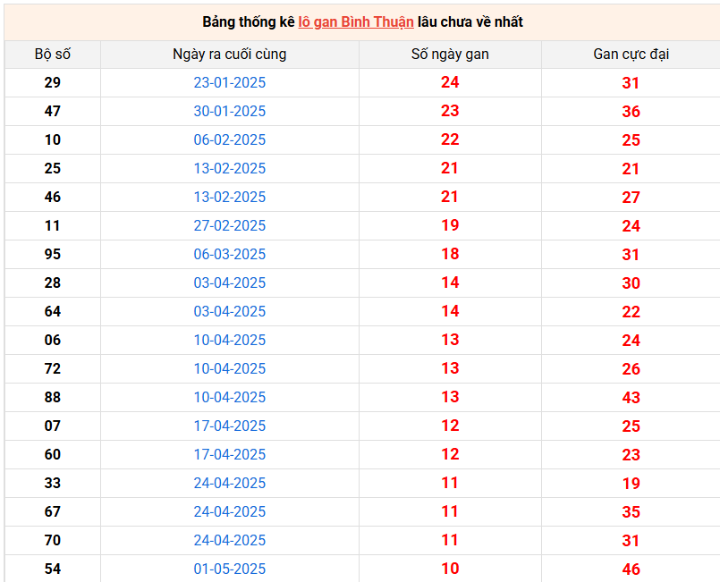 Bảng thống kê lô gan Bình Thuận lâu về nhất 17/7/2025