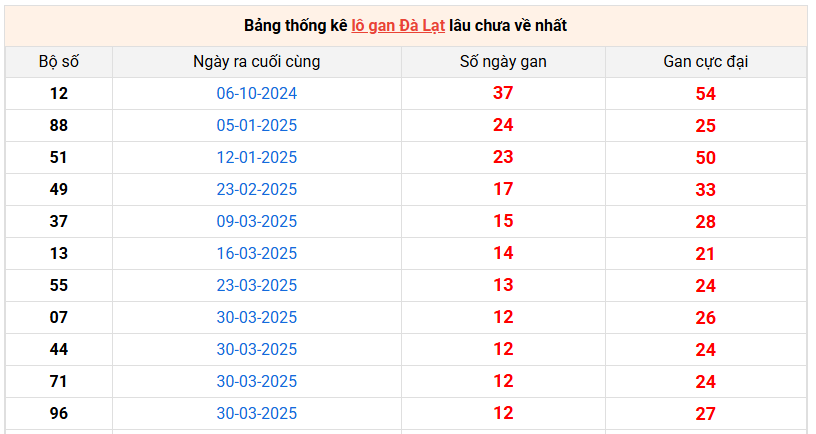 Bảng thống kê lô gan Đà Lạt lâu về nhất 29/6/2025