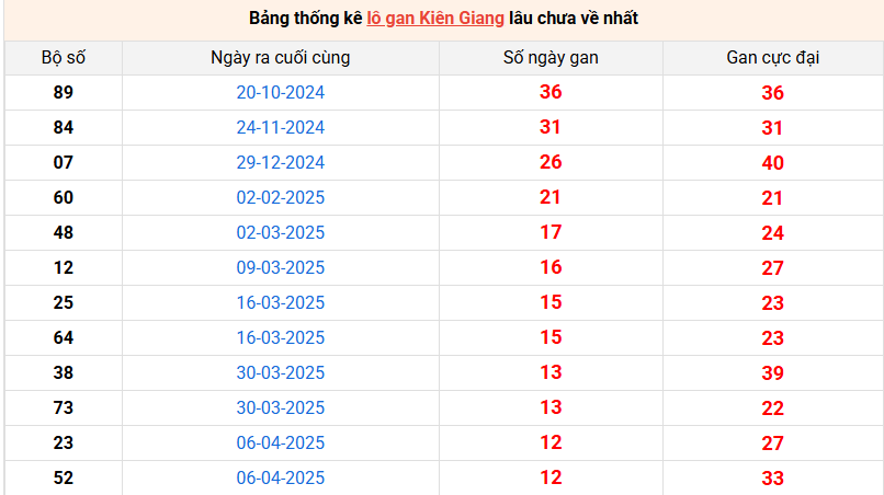 Bảng thống kê lô gan Kiên Giang lâu về nhất 06/7/2025