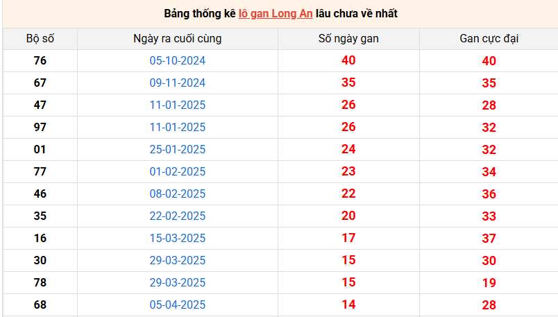 Bảng thống kê lô gan Long An lâu về nhất 19/7/2025