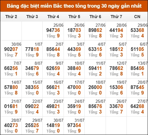 Thống kê giải đặc biệt theo tổng trong vòng 30 ngày tính đến 01/08/2025