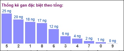 ⇒ Nhìn vào bảng thống kê gan ĐB theo tổng thì tổng 5 lâu chưa về nhất (bao gồm 10 cặp số: 05, 14, 23, 32, 41, 50, 69, 78, 87, 96) và đã 25 ngày chưa xuất hiện.