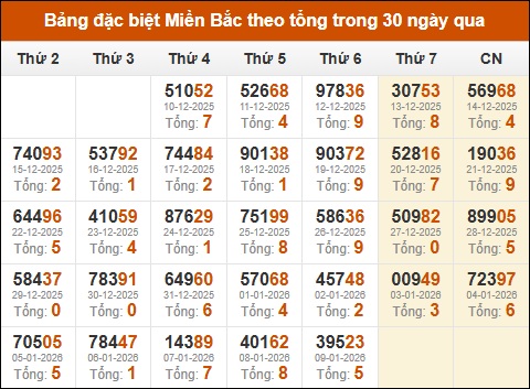 Thống kê GĐB XSMB theo tổng trong 30 ngày gần đây tính đến 10/01/2026