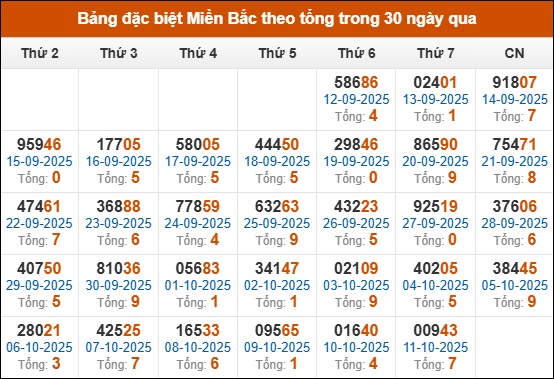 Thống kê GĐB xổ số miền Bắc theo tổng trong 30 ngày tính đến 12/10/2025