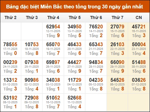 Thống kê giải đặc biệt theo tổng trong vòng 30 ngày tính đến 12/12/2025