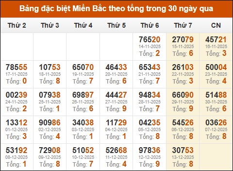 Thống kê GĐB xổ số miền Bắc theo tổng trong 30 ngày tính đến 14/12/2025