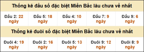 ⇒ Theo thống kê đặc biệt theo tổng 2 số cuối, ta thấy tổng đề 9 lâu chưa xuất hiện nhất (gồm có 10 cặp số: 09, 18, 27, 36, 45, 54, 63, 72, 81, 90) và đã 24 ngày chưa về.
