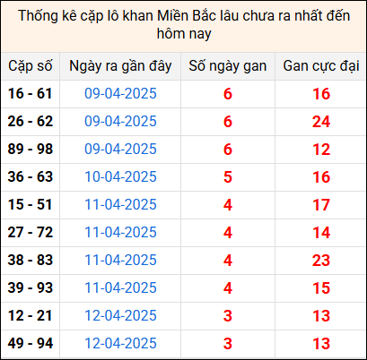 Bảng thống kê cặp lô gan lì lâu về tính tới 16/4