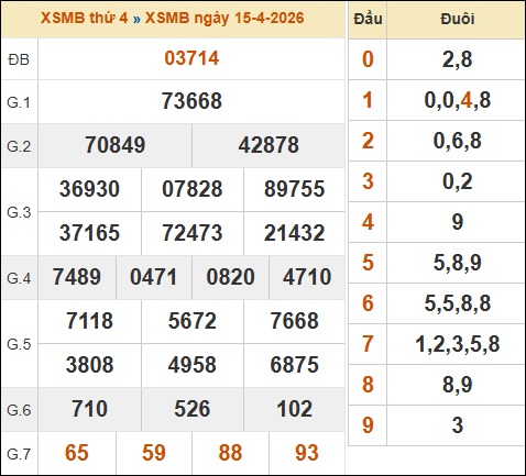 Bảng kết quả xổ số miền Bắc 15/04/2026 hôm qua
