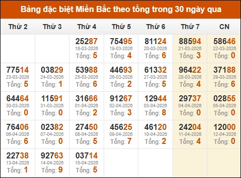 Thống kê GĐB XSMB theo tổng trong 30 ngày gần đây tính đến 16/04/2026