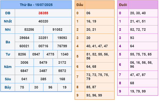 Bảng kết quả hôm qua ngày 15/7/2025