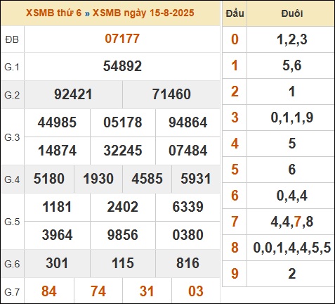 Dựa vào bảng kết quả xổ số Miền Bắc 15/08/2025 bên trên, chuyên trang mời bạn xem thống kê kết quả chi tiết sau đây: