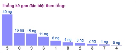 ⇒ Từ bảng thống kê trên, ta thấy tổng đặc biệt lâu chưa xuất hiện nhất là tổng 5 (bao gồm những cặp số: 05, 14, 23, 32, 41, 50, 69, 78, 87, 96), và đã 40 ngày chưa xuất hiện.