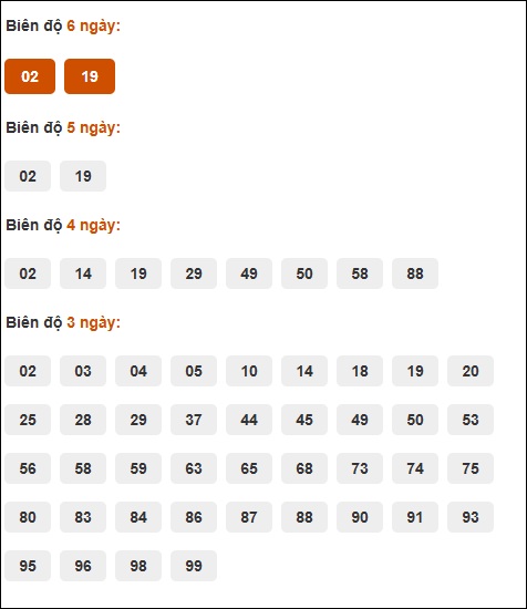 ⇒ Theo dõi thống kê gan đặc biệt theo chạm, ta thấy chạm 8 lâu chưa xuất hiện nhất (bao gồm 19 cặp số chứa số 8), và đã 13 ngày chưa xuất hiện.