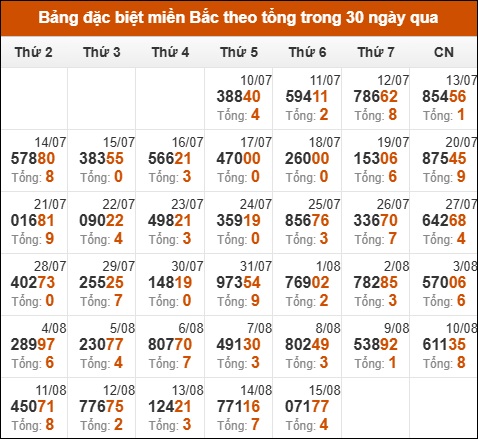 Thống kê GĐB XSMB theo tổng trong 30 ngày gần đây tính đến 16/08/2025