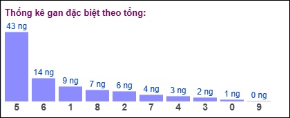 ⇒ Từ bảng thống kê ta thấy tổng đặc biệt lâu không xuất hiện nhất là tổng 5, bao gồm 10 cặp số (05, 14, 23, 32, 41, 50, 69, 78, 87, 96), với tần suất 43 ngày chưa ra.