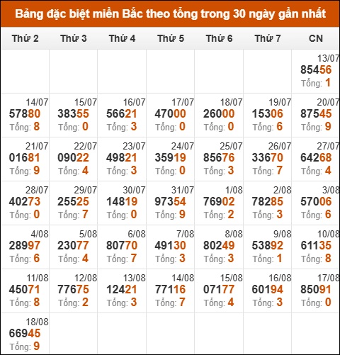 Thống kê GĐB miền Bắc theo tổng trong 30 ngày tính đến 19/08/2025