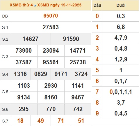 Bảng kết quả xổ số miền Bắc 19/11/2025 hôm qua