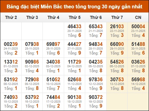 Thống kê GĐB XSMB theo tổng trong 30 ngày gần đây tính đến 20/12/2025