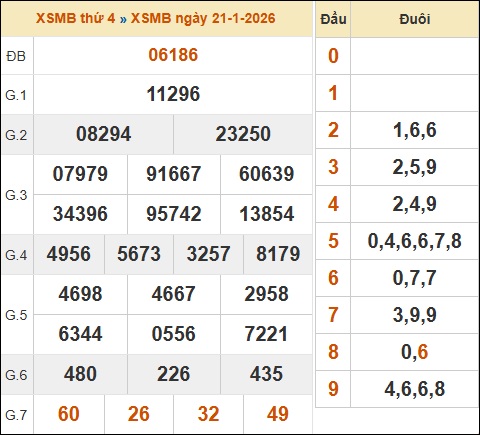 Bảng kết quả xổ số miền Bắc 21/01/2026 hôm qua