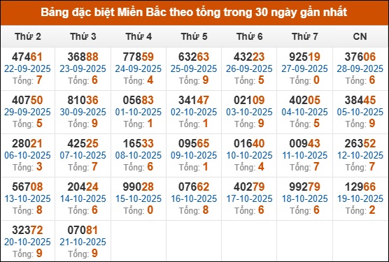 Thống kê GĐB miền Bắc theo tổng trong 30 ngày qua tính đến 22/10/2025
