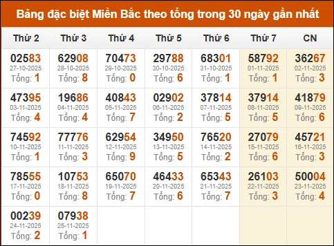 Thống kê GĐB miền Bắc theo tổng trong 30 ngày qua tính đến 26/11/2025