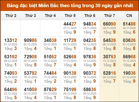 Thống kê GĐB XSMB theo tổng trong 30 ngày gần đây tính đến 27/12/2025