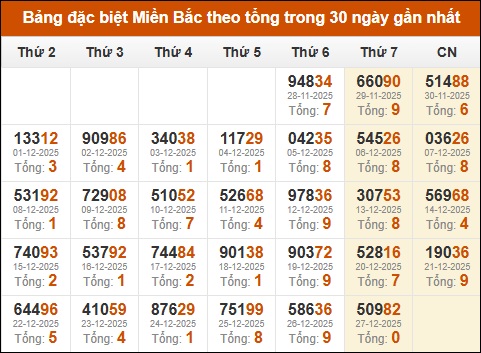 Thống kê GĐB xổ số miền Bắc theo tổng trong 30 ngày tính đến 28/12/2025