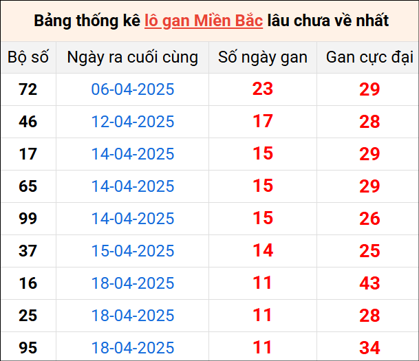 ⚡ Thống kê lô gan miền Bắc nhất: 72 - 46 - 17 - 65 - 99