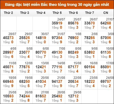 Thống kê GĐB XSMB theo tổng trong 30 ngày gần đây tính đến 30/08/2025
