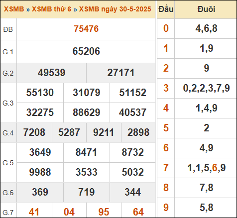 Kết quả xổ số miền Bắc ngày 30/5/2025