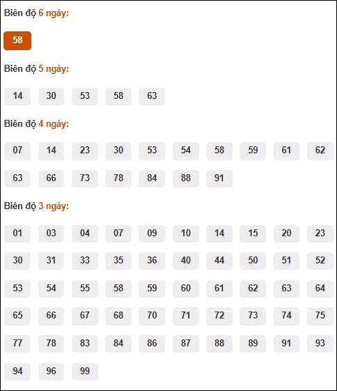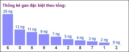 ⇒ Từ thống kê trên, ta thấy được tổng 6 gan nhất đã 26 ngày chưa xuất hiện, (bao gồm 10 cặp số: 06, 15, 24, 33, 42, 51, 60, 79, 88, 97)