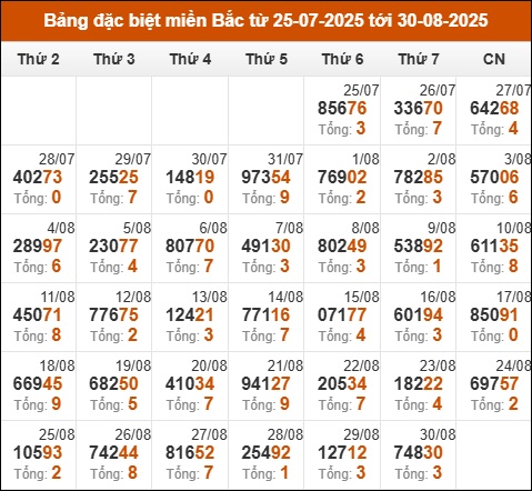 Thống kê GĐB xổ số miền Bắc theo tổng trong 30 ngày tính đến 31/08/2025