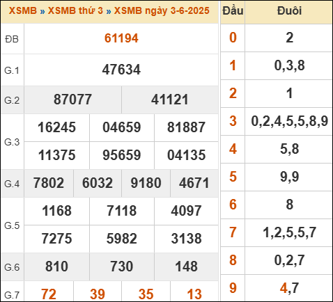 Kết quả xổ số miền Bắc ngày 3/6/2025