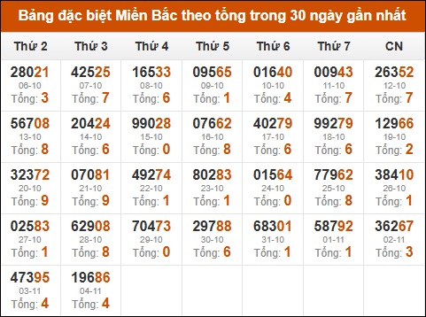 Thống kê GĐB miền Bắc theo tổng trong 30 ngày qua tính đến 05/11/2025