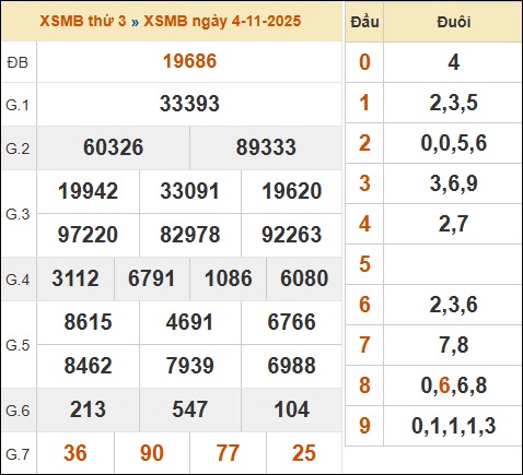 Dựa vào bảng xổ số Miền Bắc đã về ngày 04/11/2025, chuyên trang mời bạn tham khảo thống kê phân tích kết quả chi tiết sau đây: